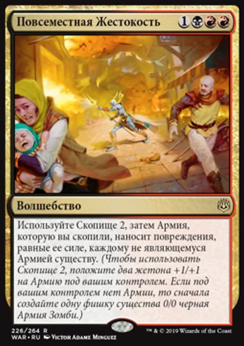 Возьмите две карты, затем используйте Скопище X, где X — количество карт в вашей руке. (Положите X жетонов +1/+1 на Армию под вашим контролем. Если под вашим контролем нет Армии, то сначала создайте одну фишку существа 0/0 черная Армия Зомби.)