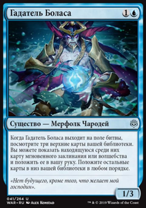 Когда Гадатель Боласа выходит на поле битвы, посмотрите три верхние карты вашей библиотеки. Вы можете показать карту мгновенного заклинания или волшебства из этих карт и положить ее в вашу руку. Положите остальные карты в низ вашей библиотеки в любом порядке.