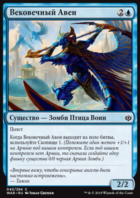Когда Вековечный Авен выходит на поле битвы, используйте Скопище 1. (Положите один жетон +1/+1 на Армию под вашим контролем. Если под вашим контролем нет Армии, то сначала создайте одну фишку существа 0/0 черная Армия Зомби.)