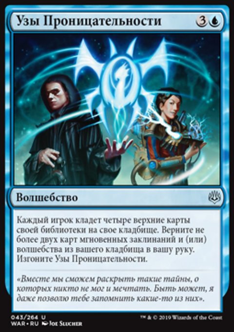 Каждый игрок кладет четыре верхние карты своей библиотеки на свое кладбище. Верните не более двух карт мгновенных заклинаний и (или) волшебства из вашего кладбища в вашу руку. Изгоните Узы Проницательности.