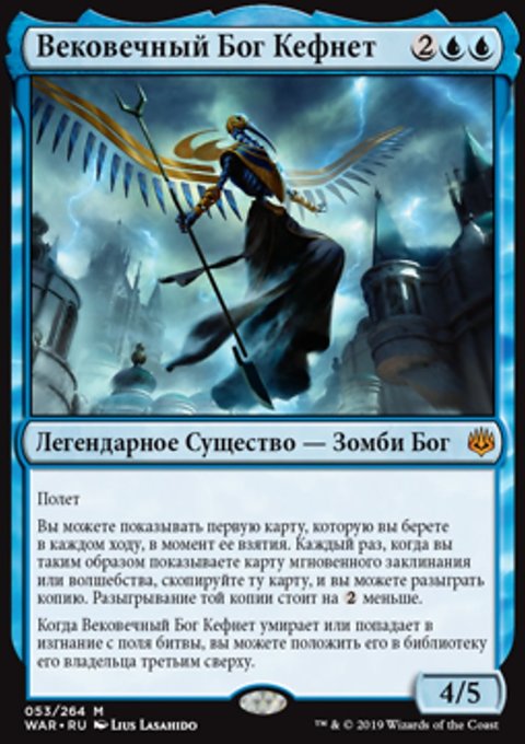 Когда Вековечный Бог Кефнет умирает или попадает в изгнание с поля битвы, вы можете положить его в библиотеку его владельца третьим сверху.
