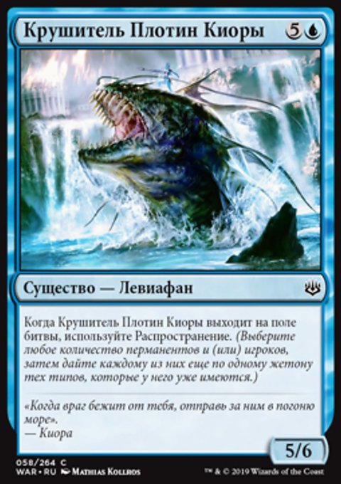Когда Крушитель Плотин Киоры выходит на поле битвы, используйте Распространение. (Выберите любое количество перманентов и (или) игроков, затем дайте каждому из них еще по одному жетону тех типов, которые у него уже имеются.)