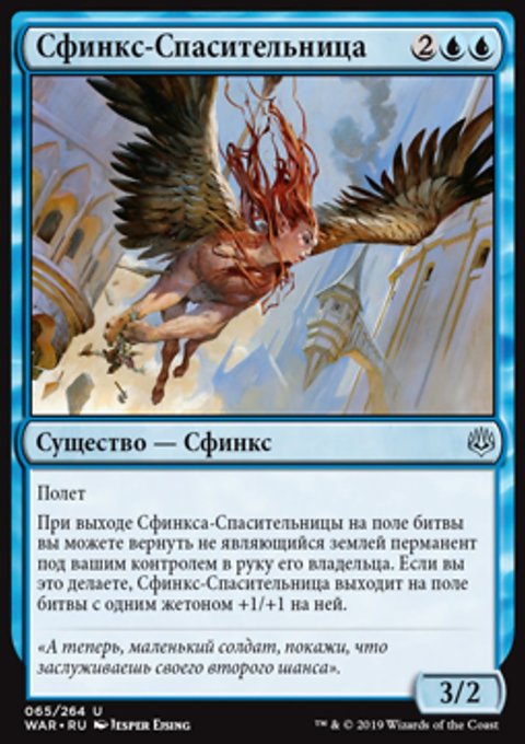 При выходе Сфинкса-Спасительницы на поле битвы вы можете вернуть не являющийся землей перманент под вашим контролем в руку его владельца. Если вы это делаете, Сфинкс-Спасительница выходит на поле битвы с одним жетоном +1/+1 на ней.