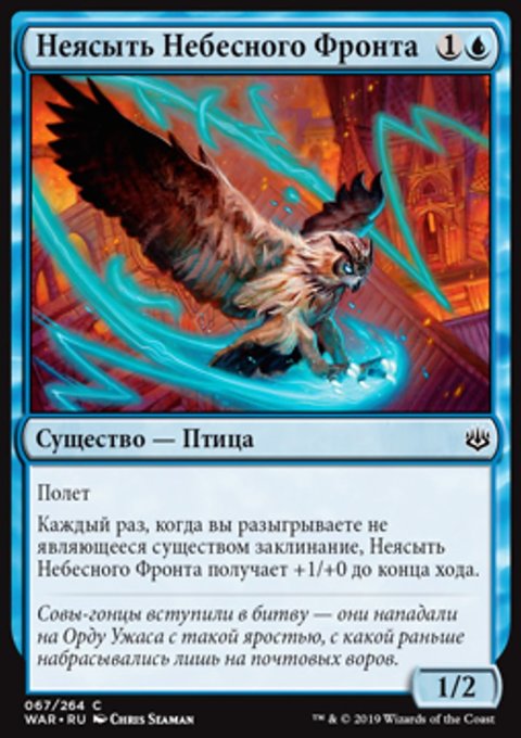 Каждый раз, когда вы разыгрываете не являющееся существом заклинание, Неясыть Небесного Фронта получает +1/+0 до конца хода.