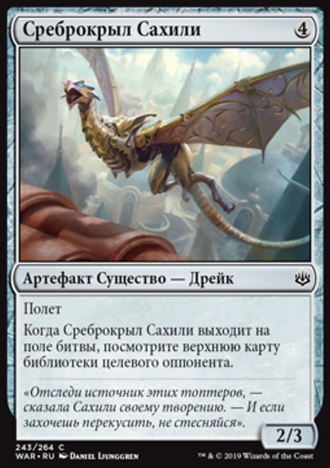 When Saheeli's Silverwing enters the battlefield, look at the top card of target opponent's library.