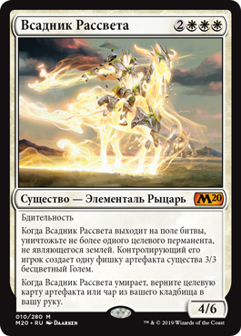 Когда Всадник Рассвета выходит на поле битвы, уничтожьте не более одного целевого перманента, не являющегося землей. Контролирующий его игрок создает одну фишку артефакта существа 3/3 бесцветный Голем.