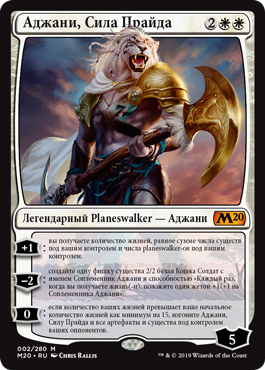 –2: создайте одну фишку существа 2/2 белая Кошка Солдат с именем Соплеменник Аджани и способностью «Каждый раз, когда вы получаете жизнь(-и), положите один жетон +1/+1 на Соплеменника Аджани».