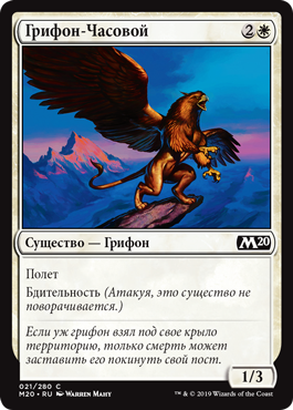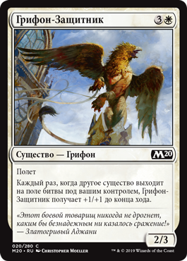 Каждый раз, когда другое существо выходит на поле битвы под вашим контролем, Грифон-Защитник получает +1/+1 до конца хода.
