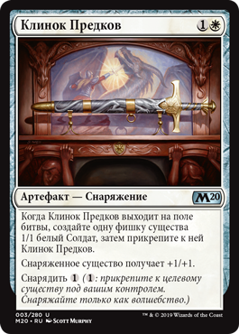 Когда Клинок Предков выходит на поле битвы, создайте одну фишку существа 1/1 белый Солдат, затем прикрепите к ней Клинок Предков.