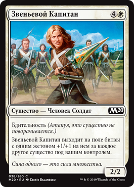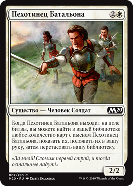 Когда Пехотинец Батальона выходит на поле битвы, вы можете найти в вашей библиотеке любое количество карт с именем Пехотинец Батальона, показать их, положить их в вашу руку, затем перетасовать вашу библиотеку.