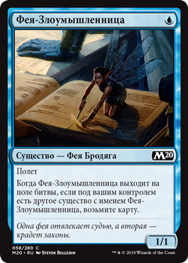 Когда Фея-Злоумышленница выходит на поле битвы, если под вашим контролем есть другое существо с именем Фея-Злоумышленница, возьмите карту.