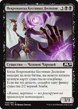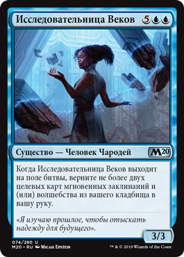 Когда Исследовательница Веков выходит на поле битвы, верните не более двух целевых карт мгновенных заклинаний и (или) волшебства из вашего кладбища в вашу руку.