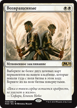 Выберите не более двух целевых карт перманентов на вашем кладбище, которые попали туда с поля битвы в этом ходу. Верните их на поле битвы повернутыми.