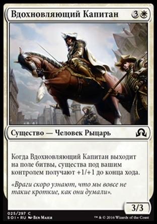 Когда Вдохновляющий Капитан выходит на поле битвы, существа под вашим контролем получают +1/+1 до конца хода.
