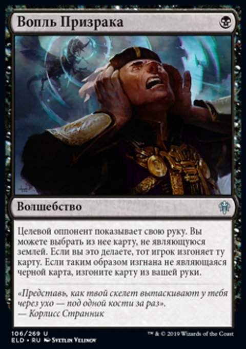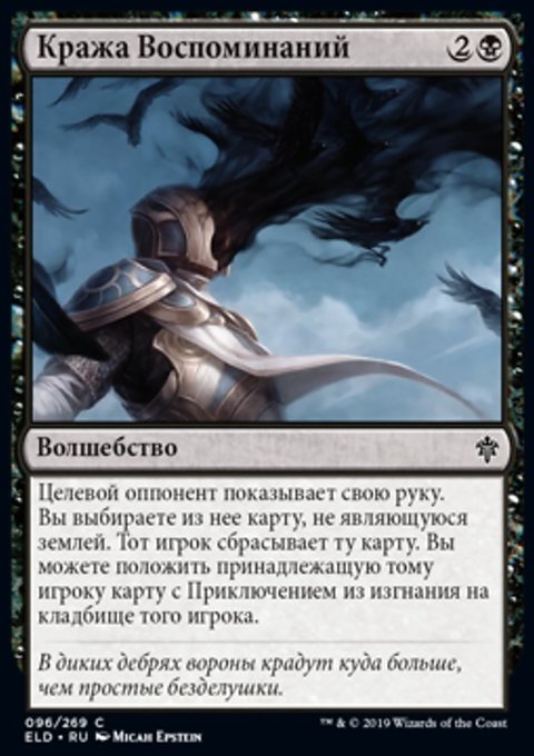 Целевой оппонент показывает свою руку. Вы выбираете из нее карту, не являющуюся землей. Тот игрок сбрасывает ту карту. Вы можете положить принадлежащую тому игроку карту с Приключением из изгнания на кладбище того игрока.