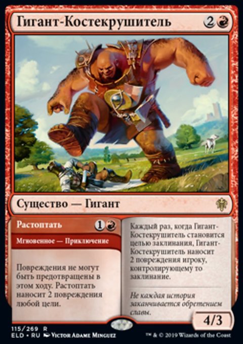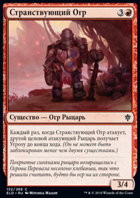 Каждый раз, когда Странствующий Огр атакует, другой целевой атакующий Рыцарь получает Угрозу до конца хода. (Он не может быть заблокирован менее чем двумя существами.)
