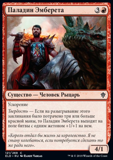 Твердость — Если на разыгрывание этого заклинания было потрачено три или больше красной маны, то Паладин Эмберета выходит на поле битвы с одним жетоном +1/+1 на нем.