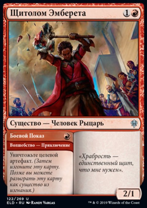 Когда Клинок Эмберета выходит на поле битвы, прикрепите его к целевому существу под вашим контролем.