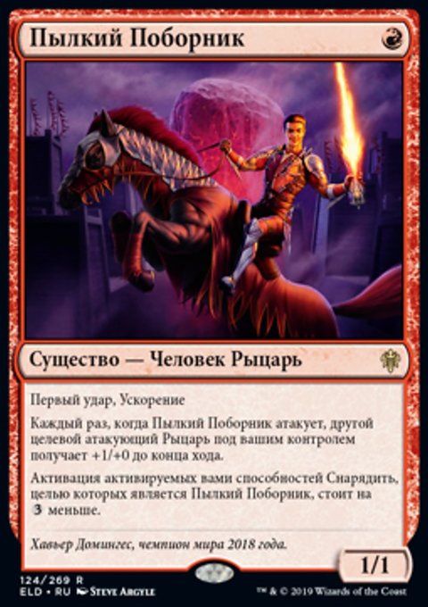 Каждый раз, когда Пылкий Поборник атакует, другой целевой атакующий Рыцарь под вашим контролем получает +1/+0 до конца хода.
