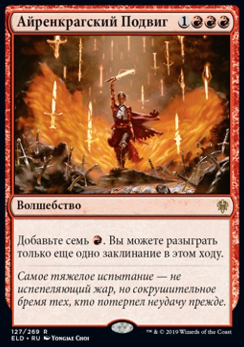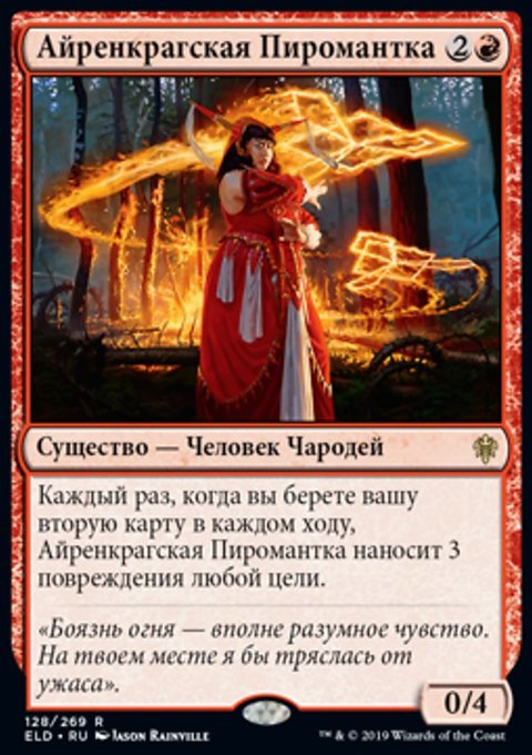 Каждый раз, когда вы берете вашу вторую карту в каждом ходу, Айренкрагская Пиромантка наносит 3 повреждения любой цели.