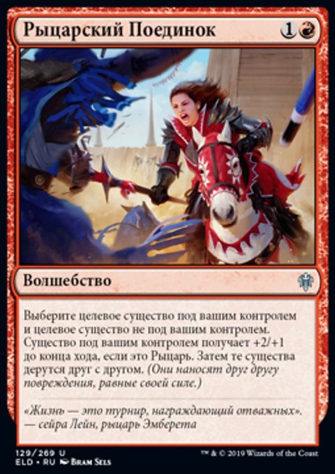 Выберите целевое существо под вашим контролем и целевое существо не под вашим контролем. Существо под вашим контролем получает +2/+1 до конца хода, если это Рыцарь. Затем те существа дерутся друг с другом. (Они наносят друг другу повреждения, равные своей силе.)