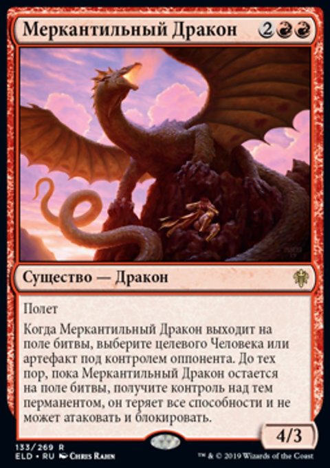 Когда Меркантильный Дракон выходит на поле битвы, выберите целевого Человека или артефакт под контролем оппонента. До тех пор, пока Меркантильный Дракон остается на поле битвы, получите контроль над тем перманентом, он теряет все способности и не может атаковать и блокировать.