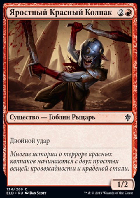 Драка Красных Колпаков наносит 4 повреждения целевому существу или planeswalker-у. Если таким образом наносятся повреждения не являющемуся красным перманенту, вы жертвуете землю.