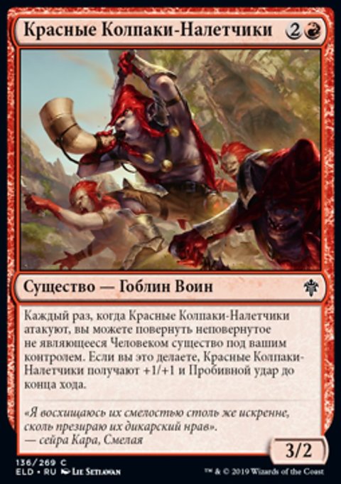 Каждый раз, когда Красные Колпаки-Налетчики атакуют, вы можете повернуть неповернутое не являющееся Человеком существо под вашим контролем. Если вы это делаете, Красные Колпаки-Налетчики получают +1/+1 и Пробивной удар до конца хода.