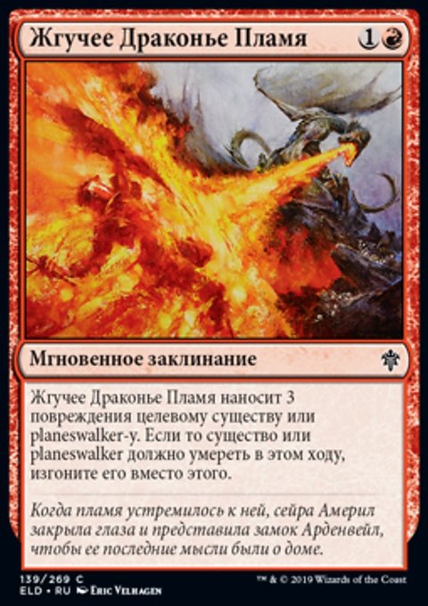 Жгучее Драконье Пламя наносит 3 повреждения целевому существу или planeswalker-у. Если то существо или planeswalker должно умереть в этом ходу, изгоните его вместо этого.