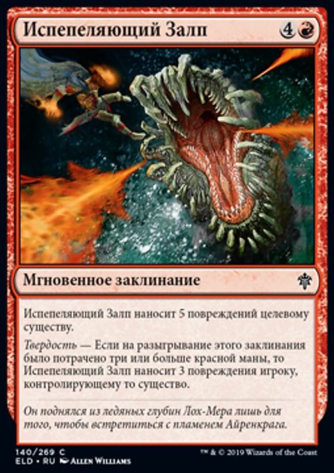 Твердость — Если на разыгрывание этого заклинания было потрачено три или больше красной маны, то Испепеляющий Залп наносит 3 повреждения игроку, контролирующему то существо.