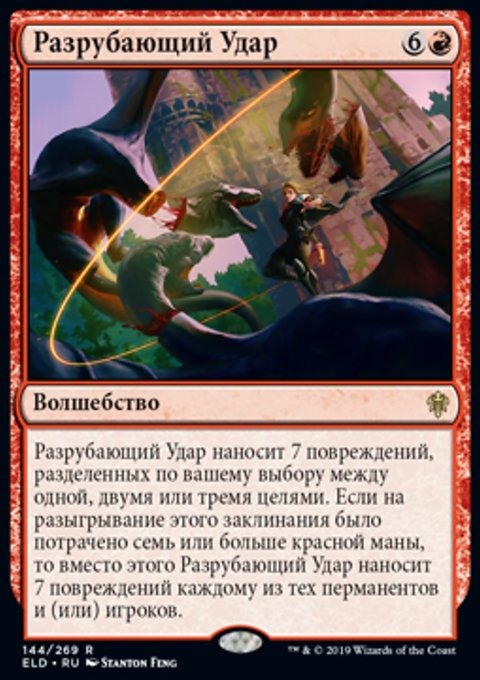 Разрубающий Удар наносит 7 повреждений, разделенных по вашему выбору между одной, двумя или тремя целями. Если на разыгрывание этого заклинания было потрачено семь или больше красной маны, то вместо этого Разрубающий Удар наносит 7 повреждений каждому из тех перманентов и (или) игроков.
