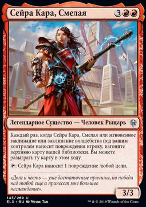 Каждый раз, когда Сейра Кара, Смелая или мгновенное заклинание или заклинание волшебства под вашим контролем наносит повреждения игроку, изгоните верхнюю карту вашей библиотеки. Вы можете разыграть ту карту в этом ходу.