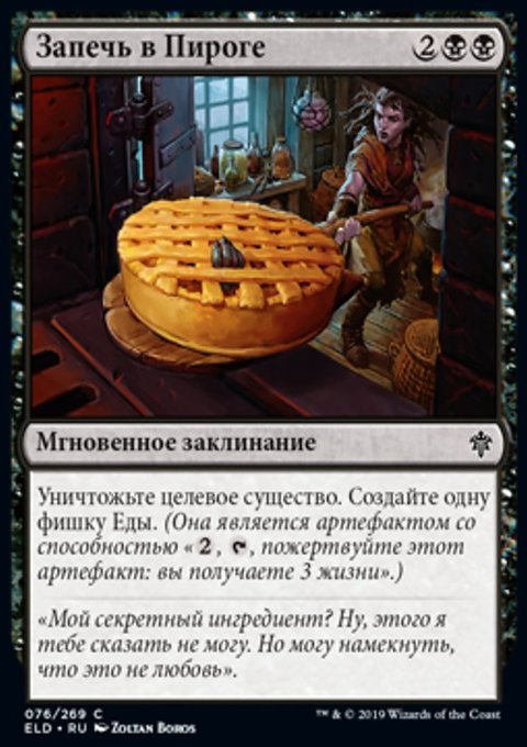 Уничтожьте целевое существо. Создайте одну фишку Еды. (Она является артефактом со способностью «