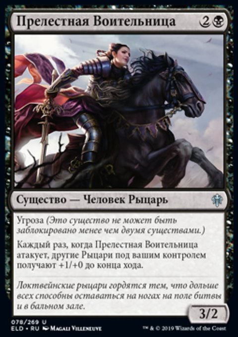 Каждый раз, когда Прелестная Воительница атакует, другие Рыцари под вашим контролем получают +1/+0 до конца хода.