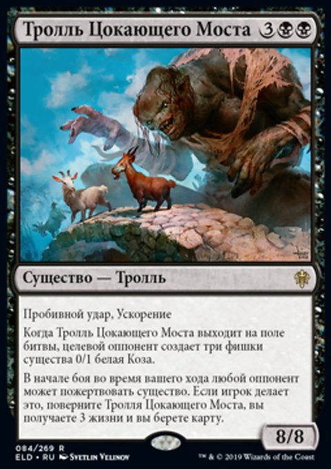 Когда Тролль Цокающего Моста выходит на поле битвы, целевой оппонент создает три фишки существа 0/1 белая Коза.