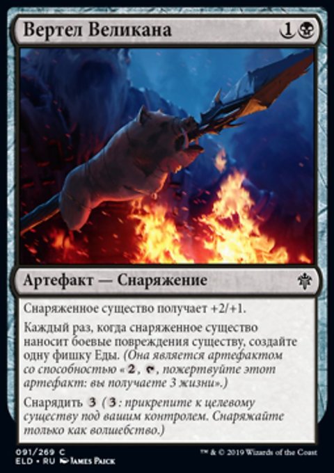 Каждый раз, когда снаряженное существо наносит боевые повреждения существу, создайте одну фишку Еды. (Она является артефактом со способностью «