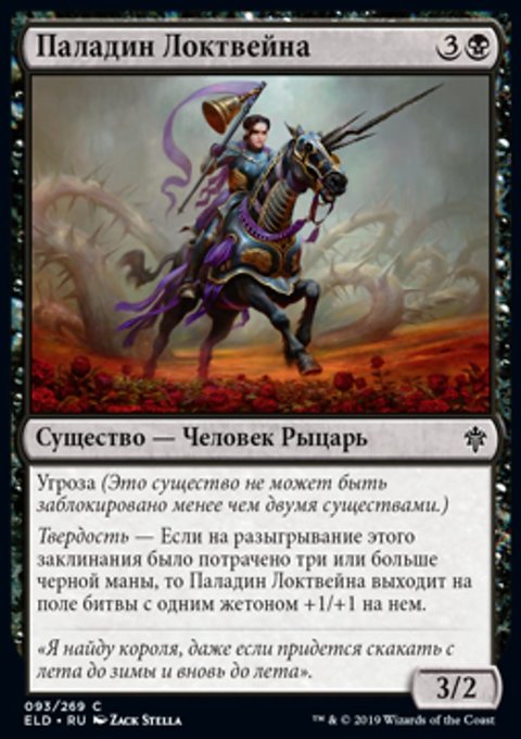 Твердость — Если на разыгрывание этого заклинания было потрачено три или больше черной маны, то Паладин Локтвейна выходит на поле битвы с одним жетоном +1/+1 на нем.
