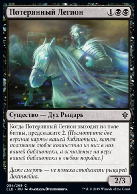 Когда Потерянный Легион выходит на поле битвы, предскажите 2. (Посмотрите две верхние карты вашей библиотеки, затем положите любое количество из них в низ вашей библиотеки, а остальные на верх вашей библиотеки в любом порядке.)