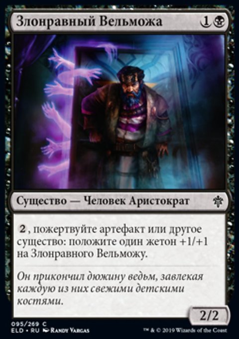 , пожертвуйте артефакт или другое существо: положите один жетон +1/+1 на Злонравного Вельможу.