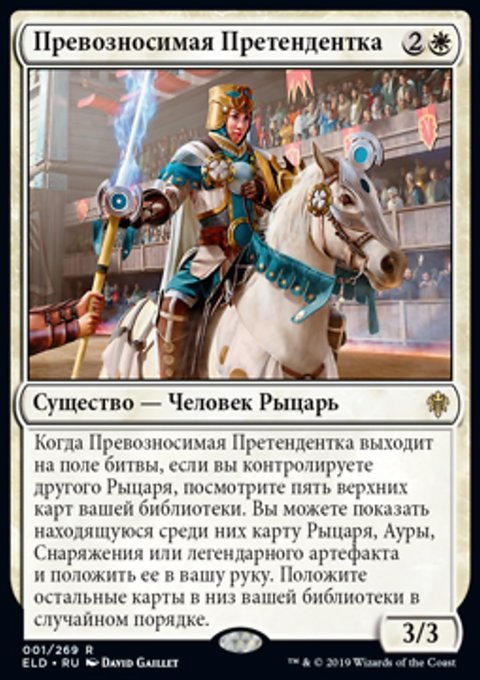 Когда Превозносимая Претендентка выходит на поле битвы, если вы контролируете другого Рыцаря, посмотрите пять верхних карт вашей библиотеки. Вы можете показать находящуюся среди них карту Рыцаря, Ауры, Снаряжения или легендарного артефакта и положить ее в вашу руку. Положите остальные карты в низ вашей библиотеки в случайном порядке.