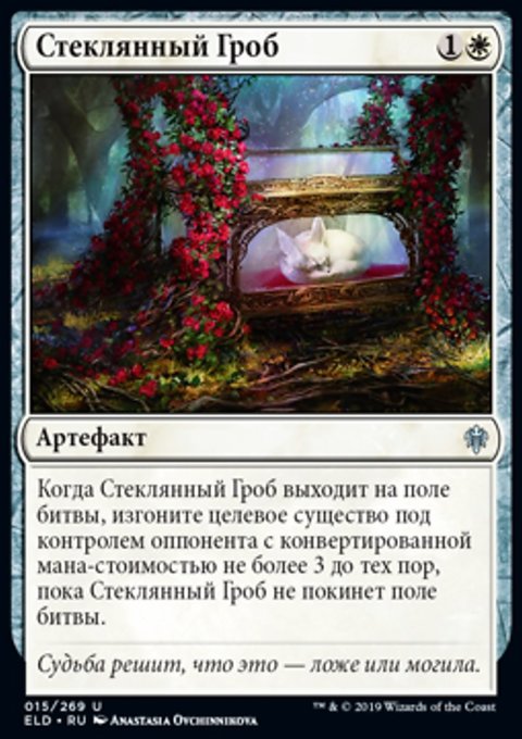 Когда Стеклянный Гроб выходит на поле битвы, изгоните целевое существо под контролем оппонента с конвертированной мана-стоимостью не более 3 до тех пор, пока Стеклянный Гроб не покинет поле битвы.