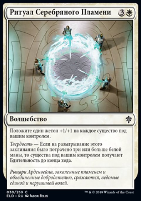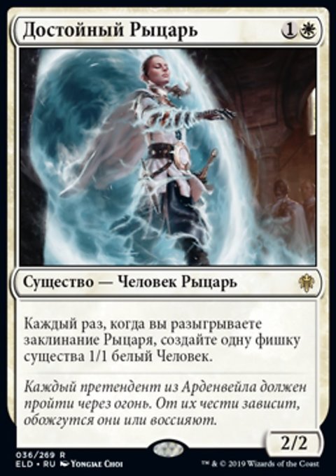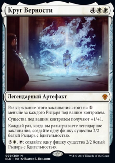 Каждый раз, когда вы разыгрываете легендарное заклинание, создайте одну фишку существа 2/2 белый Рыцарь с Бдительностью.