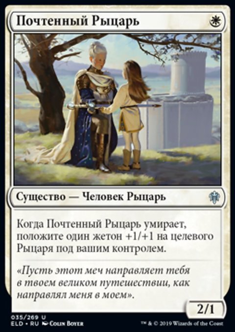 Создайте одну фишку существа 2/2 белый Рыцарь с Бдительностью. (Затем изгоните эту карту. Позже вы можете разыграть эту карту как существо из изгнания.)