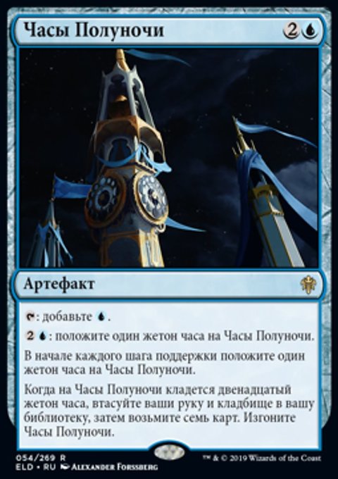 Когда на Часы Полуночи кладется двенадцатый жетон часа, втасуйте ваши руку и кладбище в вашу библиотеку, затем возьмите семь карт. Изгоните Часы Полуночи.