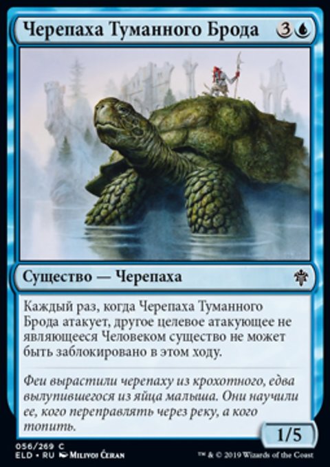 Каждый раз, когда Черепаха Туманного Брода атакует, другое целевое атакующее не являющееся Человеком существо не может быть заблокировано в этом ходу.