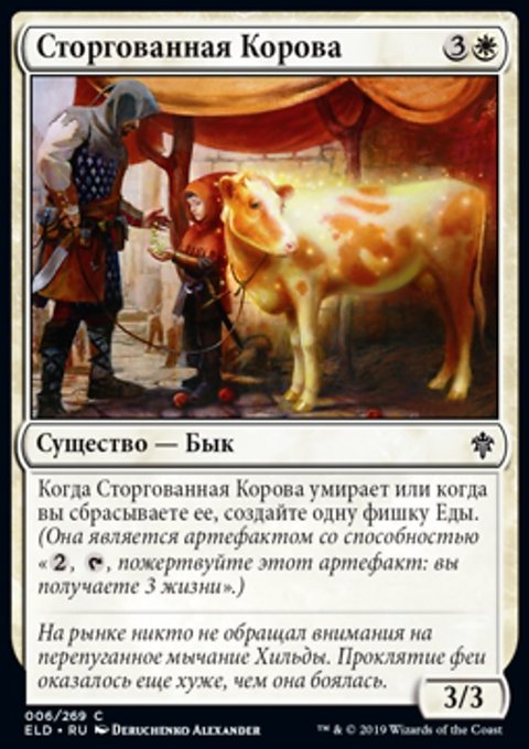 Когда Сторгованная Корова умирает или когда вы сбрасываете ее, создайте одну фишку Еды. (Она является артефактом со способностью «
