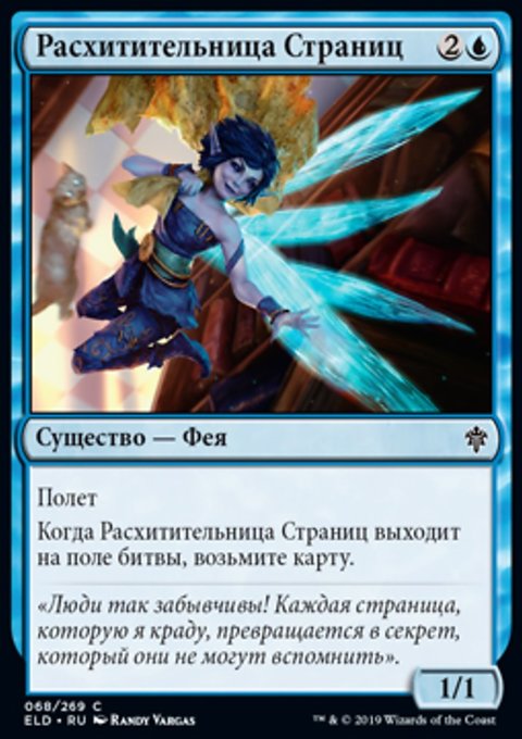 Когда Расхитительница Страниц выходит на поле битвы, возьмите карту.
