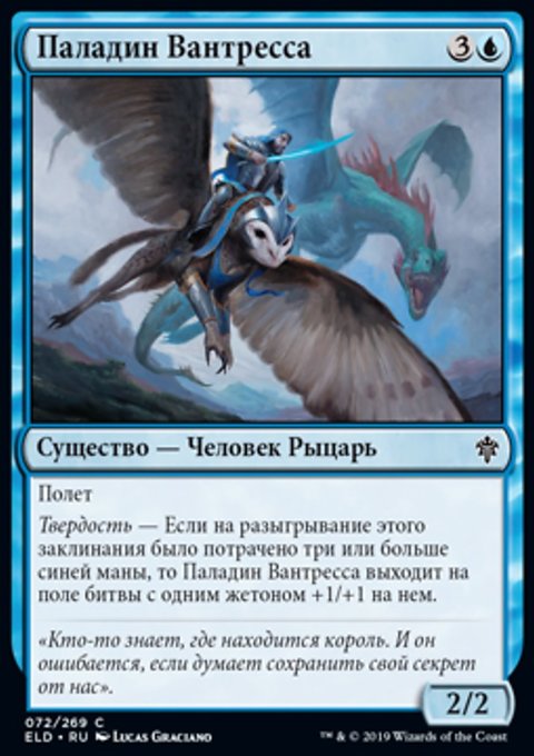 Твердость — Если на разыгрывание этого заклинания было потрачено три или больше синей маны, то Паладин Вантресса выходит на поле битвы с одним жетоном +1/+1 на нем.