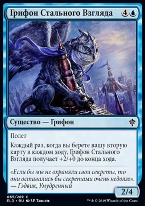 Каждый раз, когда вы берете вашу вторую карту в каждом ходу, Грифон Стального Взгляда получает +2/+0 до конца хода.