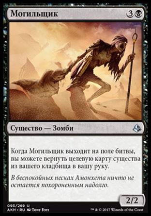 Когда Могильщик выходит на поле битвы, вы можете вернуть целевую карту существа из вашего кладбища в вашу руку.